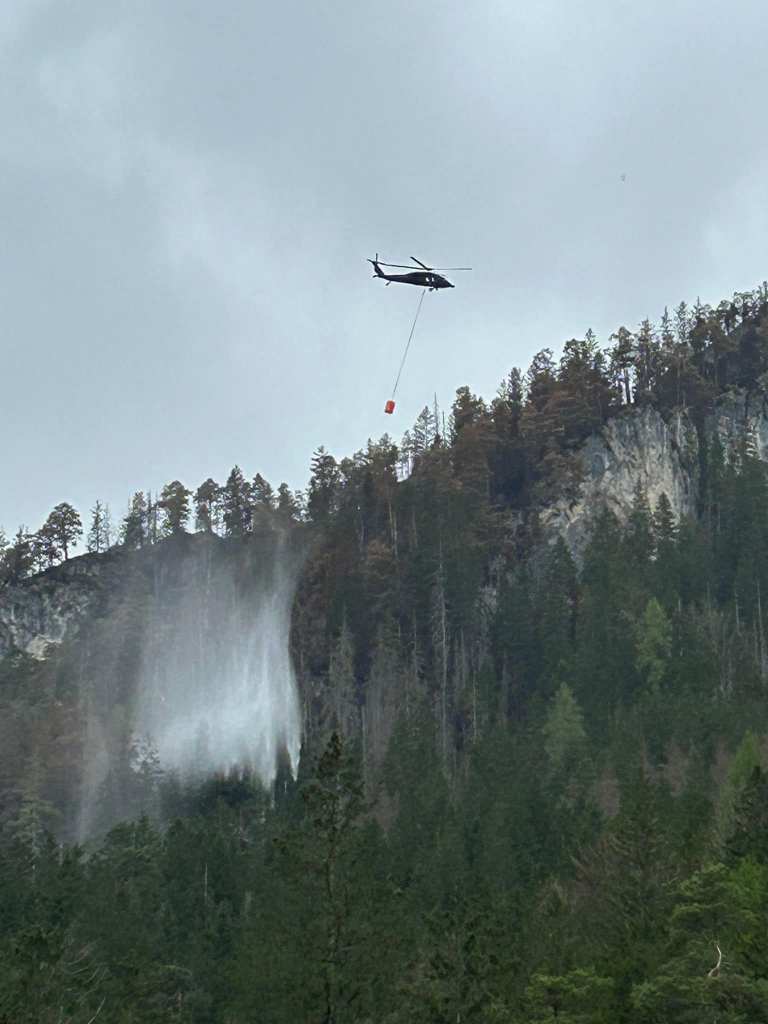 Die Mannschaft war mit weiteren Kameraden des Abschnitt Schladming für die Wasserversorgung des Black Hawk vom Bundesheer zuständig. Zur Zeit sieht es so aus, dass der Brand eingedämmt ist.