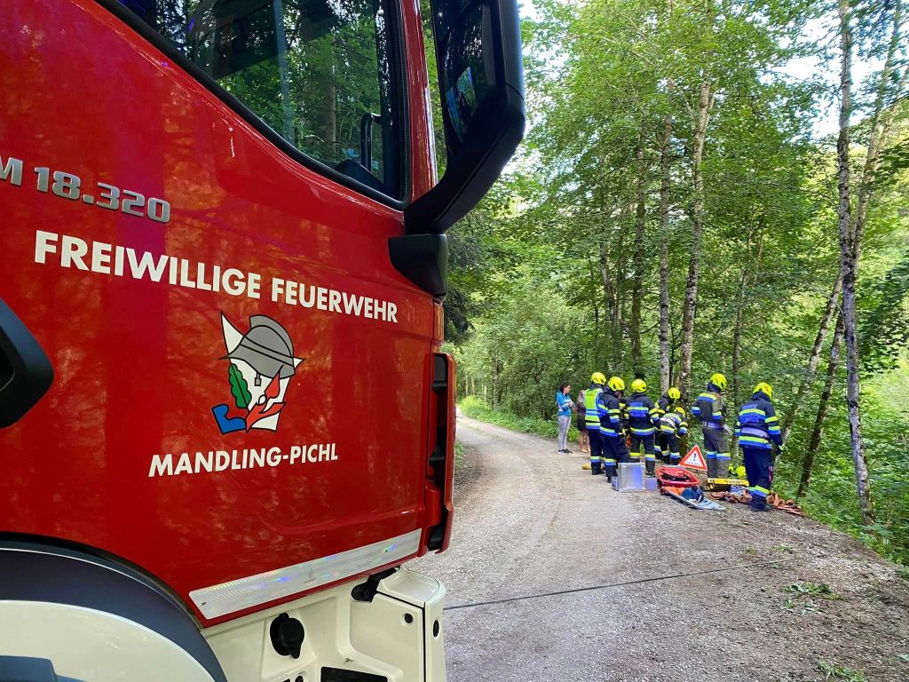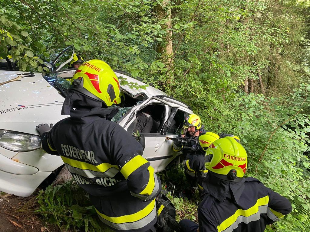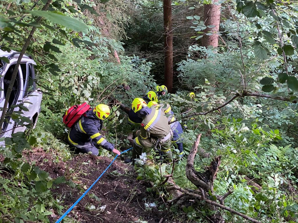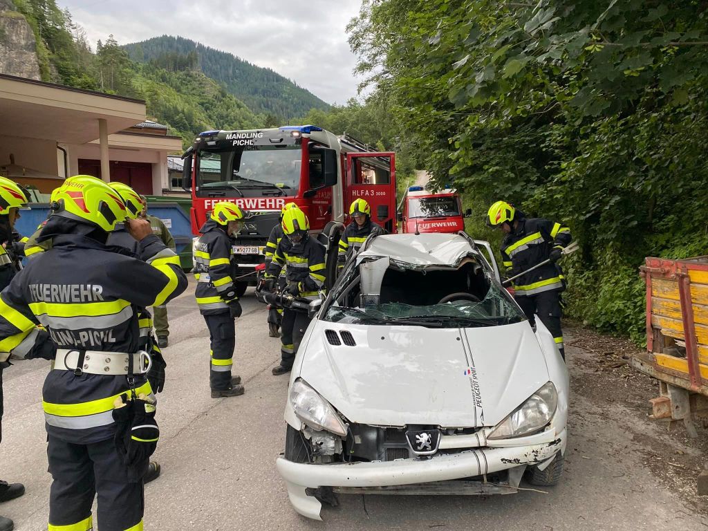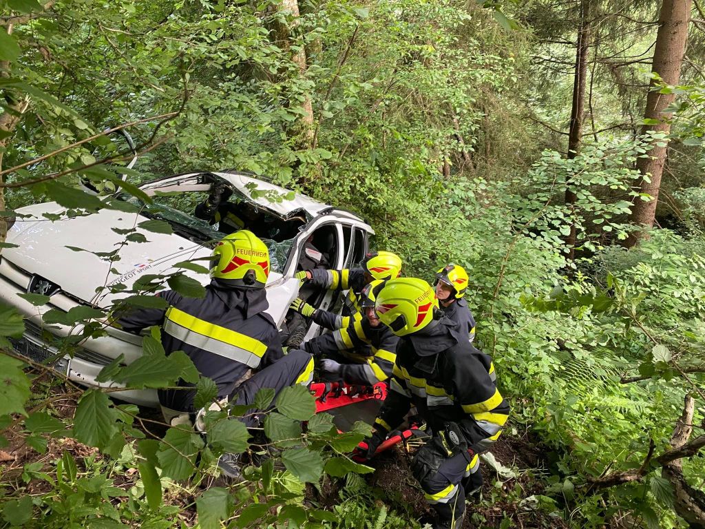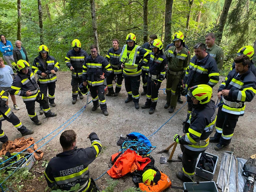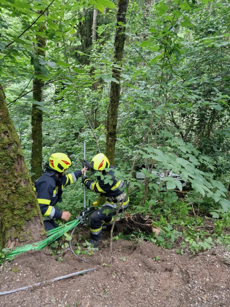 Übungsszenario: PKW in unwegsamen Gelände abgestürzt, eine Person eingeklemmt. Das Fahrzeug wurde zuerst gesichert und ein Brandschutz aufgebaut. Mittels hydraulischem Rettungsgerät wurde die verletzte Person befreit und mit der Korbtrage und Seiltechniken zur Straße gebracht.Danach wurde das Fahrzeug mit der Seilwinde wieder auf die Straße gezogen. Beim Fahrzeug wurden dann noch verschiedene Schneidtechniken durchgeführt.
