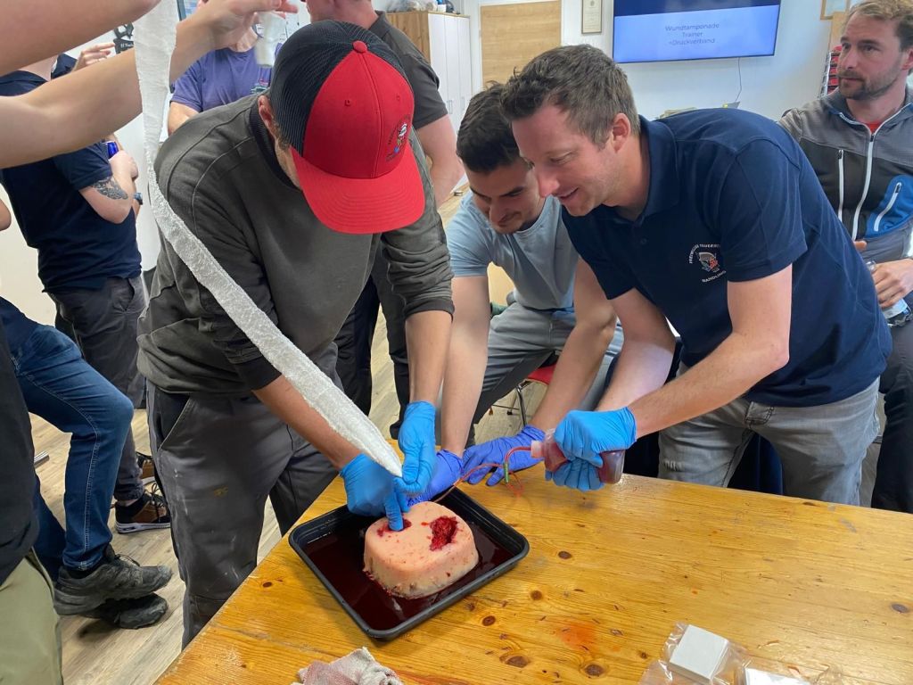 Unser Ausbilder vermittelte uns lebensrettende Techniken und Taktiken zur Stillung kritischer Blutungen sowie zur Versorgung lebensbedrohlicher Verletzungen. In praxisnahen Übungsszenarien trainierten wir unter anderem die effiziente Blutstillung mittels Tourniquet, Wundtamponagen und Druckverbänden (Easybandage). Ein weiterer Schwerpunkt lag auf dem taktischen Vorgehen bei einer Vielzahl von Verletzten (MANV) unter Einsatz von limitiertem Versorgungsmaterial.
